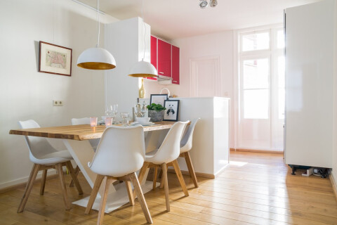 De strak uitgevoerde keuken is uitgevoerd met hoogglans rode kastjes en heeft een extra kastenwand voorzien van de koel/vrieskasten. Verder is de keuken voorzien van gewenste inbouwapparatuur.