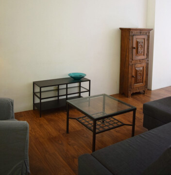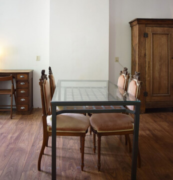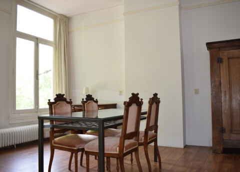 The fully furnished studio is situated on the second floor. The kitchen and dining room are situated at the frontside of the building, taking advantage of the large amount of natural light from the big windows in the front facade. The dining room consists of a table that seats 4 people and also includes a small desk space. The kitchen is equipped with a sink, four-pit gas stove, microwave-oven combination and a refrigerator with freezer compartment. Smaller equipment like a waterboiler and a coffee machine are also present.